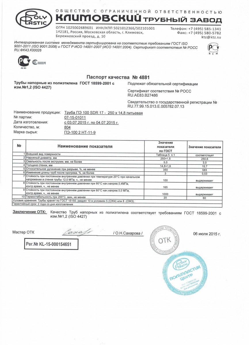 | Труба ПЭ63 SDR17 для х/в Дн 250х14,8 Ру6,3 (PN6,3) нап 40C в отрезках 12м ГОСТ 18599-2001 | 250 | 4864 руб. | 4864 руб. |